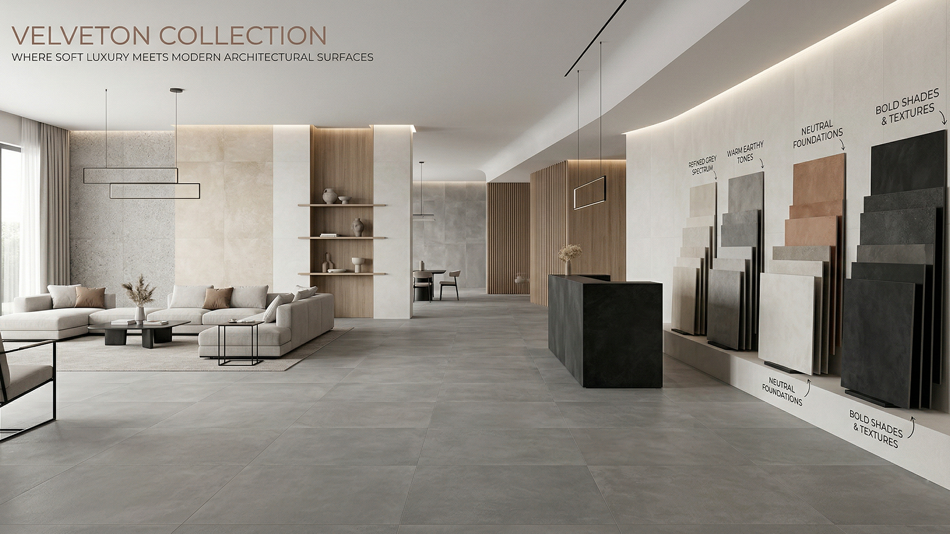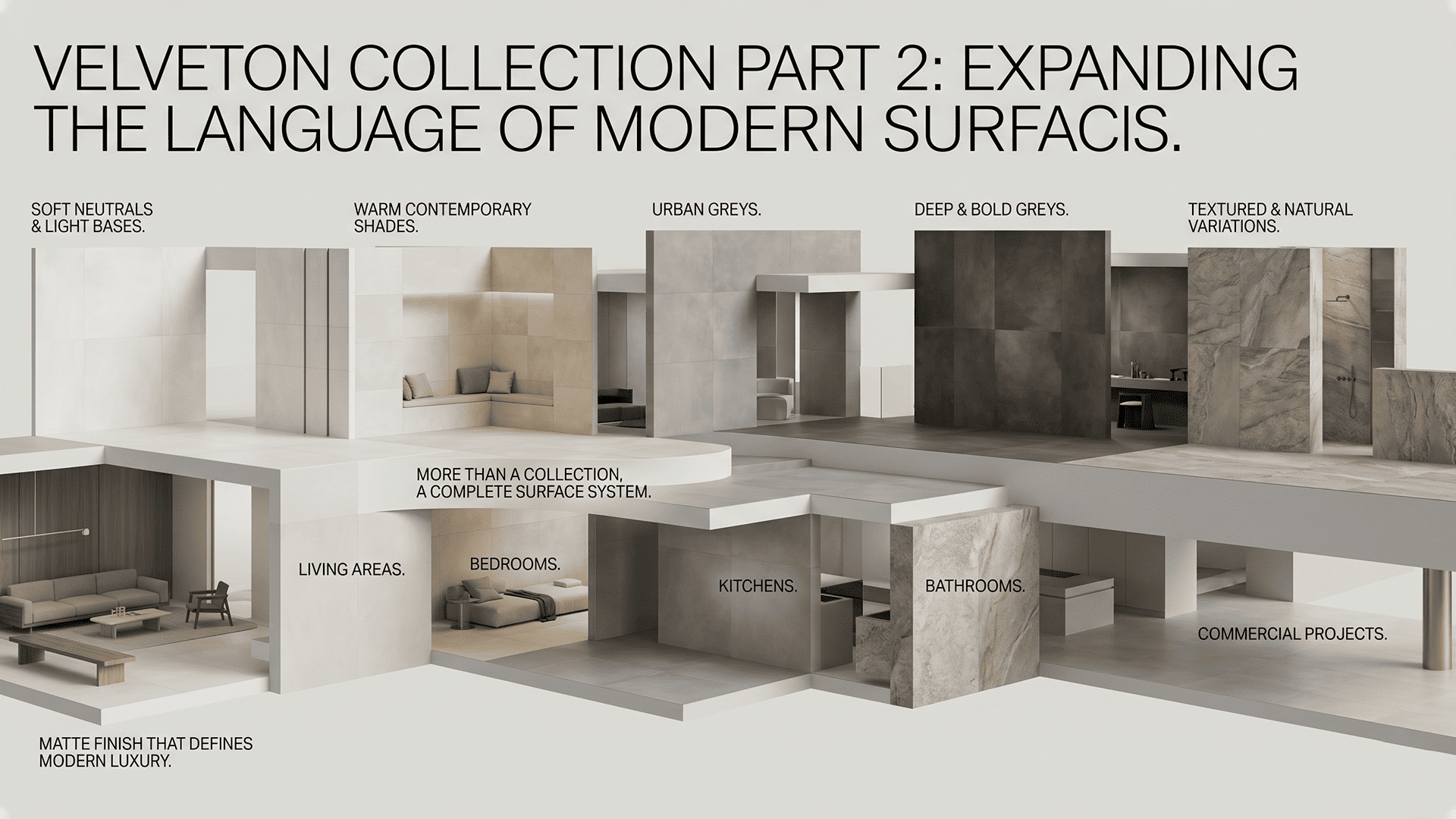 Explore Velveton Collection Part 2 with matte cement and stone look tiles. Create seamless, modern interiors with durable, st